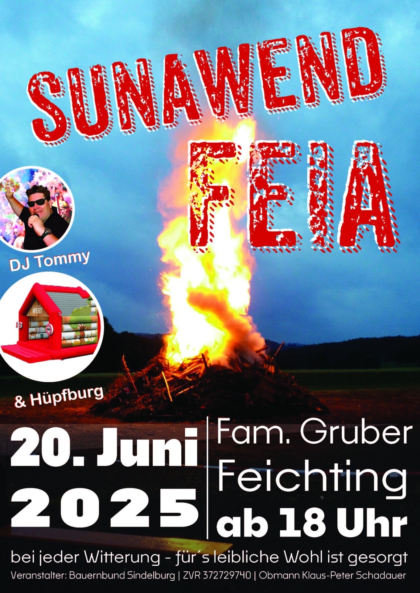 Herzliche Einladung zum Sunawend-Feia! Für Musik und Tanz sorgt DJ Tommy. Für die Kinder gibt es eine Hüpfburg. Für's leibliche Wohl sorgt der Bauernbund wie gewohnt mit heimischen Köstlichkeiten aus regionaler Herkunft.Sonnwendfeuer des Bauernbundes