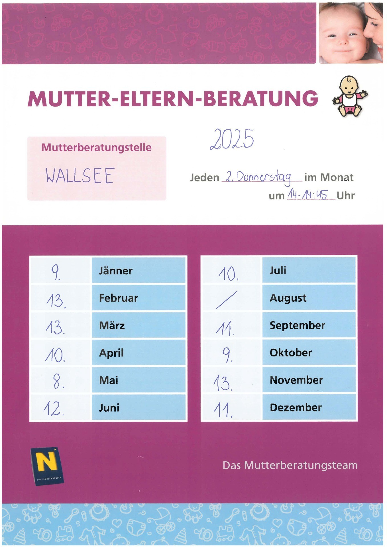 jeden 2. Donnerstag im Monat findet im NÖ PBZ Seminarraum, Ardaggerstraße 12 um 14:00 Uhr eine Mutter-Eltern Beratung statt. Auf Ihr kommen freuen sich: Dr. Albin Mischkounig - Kinderfacharzt Isabella Schmutz-Kohlert